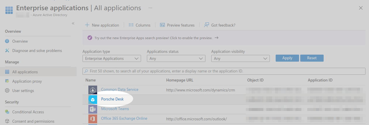 Click on the 'Enterprise applications' item in the side menu to see the list of connected and pending applications for your organisation.